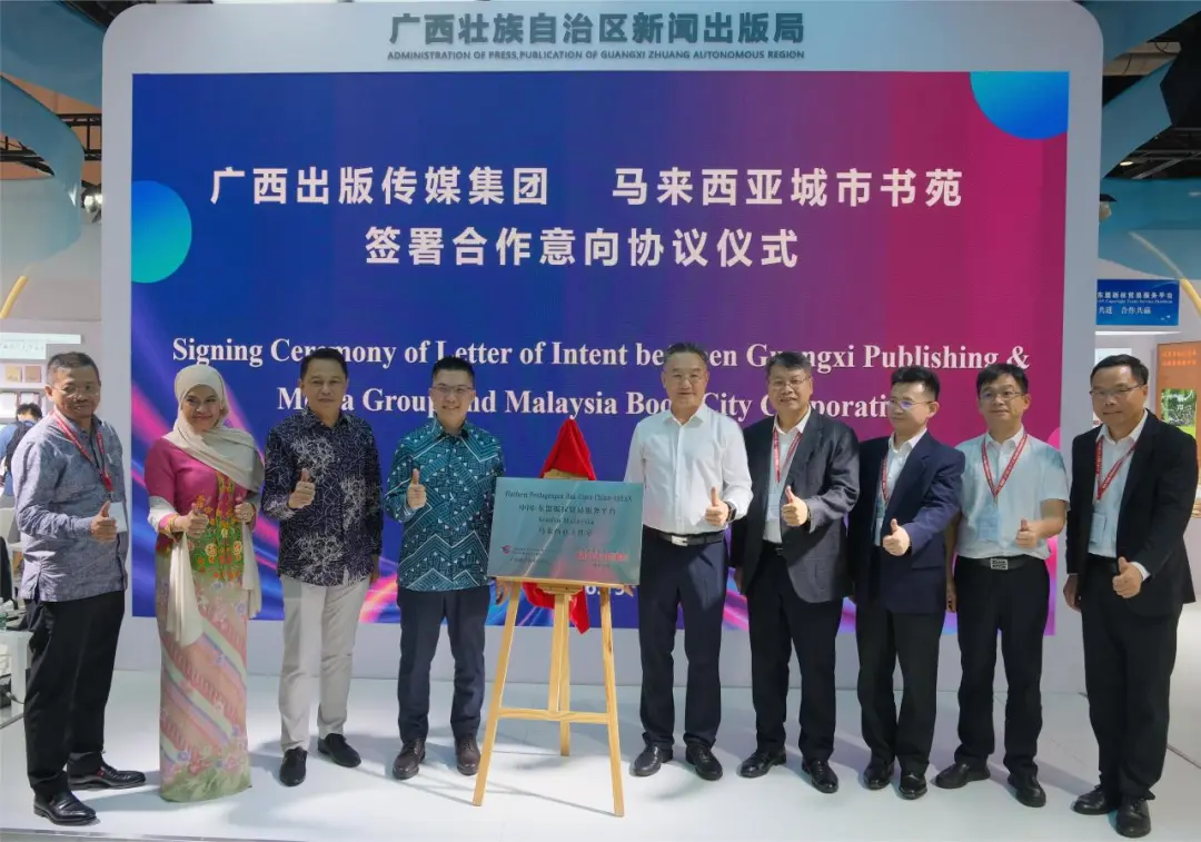 活动现场举行了广西出版传媒集团与马来西亚城市书苑合作意向签约仪式,为中国-东盟版权贸易服务平台马来西亚工作室的启动揭牌。